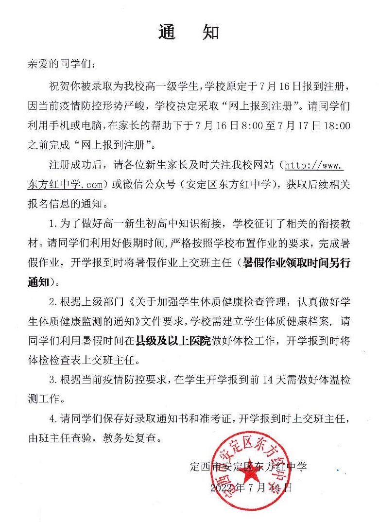 安定区东方红中学学生体检安排