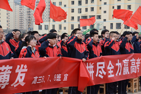 随后,在学生代表赵雅温、杜建德同学的带领下,全体高三学子郑重宣誓:“……冲刺100天,我们斗志昂扬,永不言弃!拼搏100天,我们自信自强,全力以赴!请父母相信,我们是有理想的人,一定不让你们伤心!请老师放心,我们是有志气的人,一定不会让你们失望!请学校放心,我们是有潜力的人,一定会为母校争光……”这铮铮誓言,嘹亮激越的呐喊,庄严郑重的神情感染了在场的每一个人,经久不息的宣誓响彻会场。